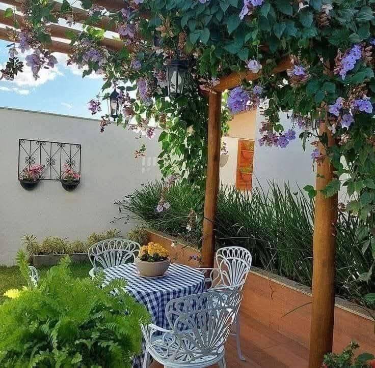 Climbing Vines: Wisteria, clematis, or jasmine growing on a trellis, arbor, or the side of the house.